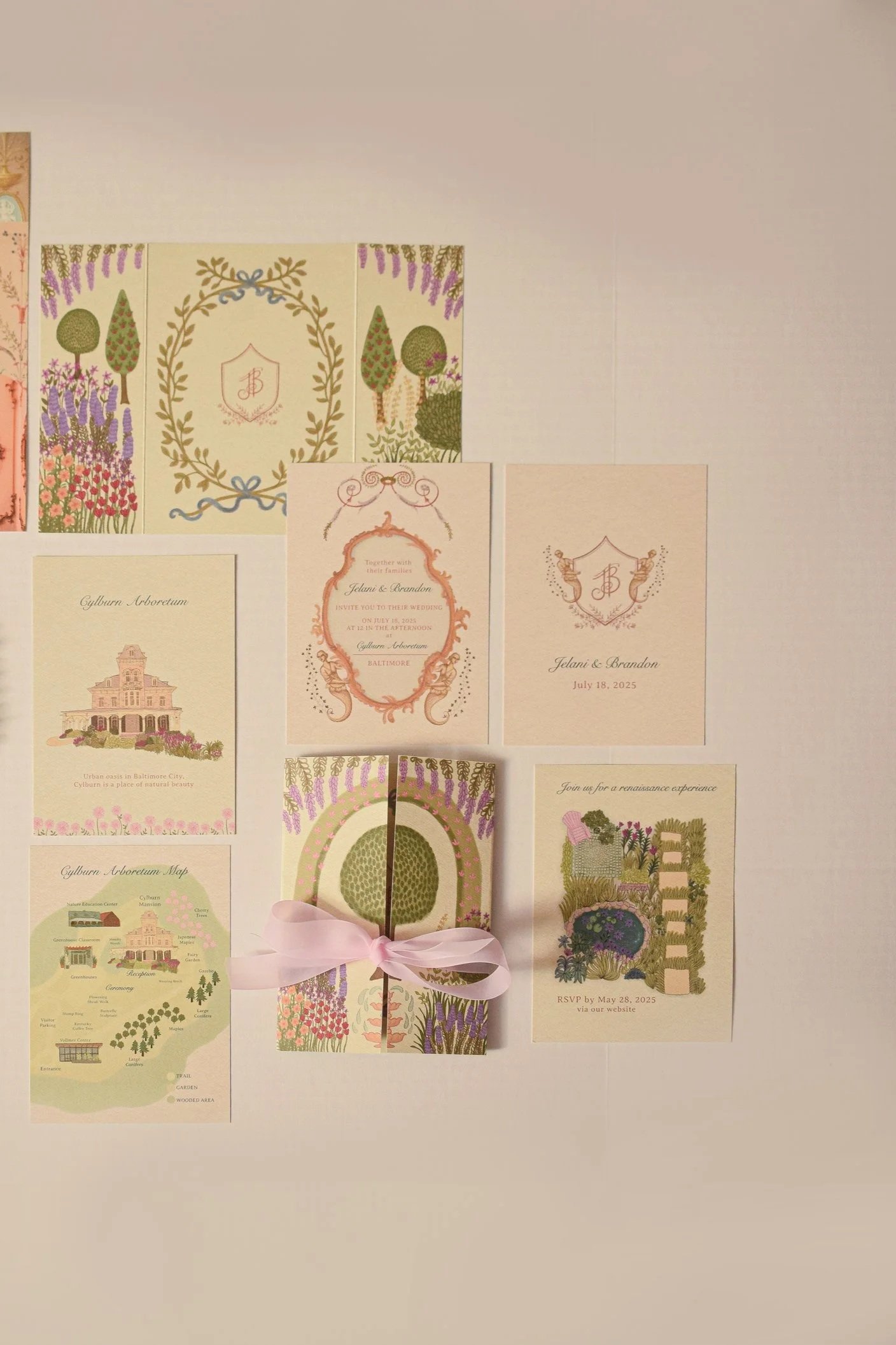Artwork: watercolor crests, venue illustrations, maps, florals, cultural or symbolic motifs